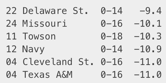 In fact, Missouri’s average margin of defeat of 10.1 points per game ranks second-lowest among the 58 teams that have gone winless since 1997: